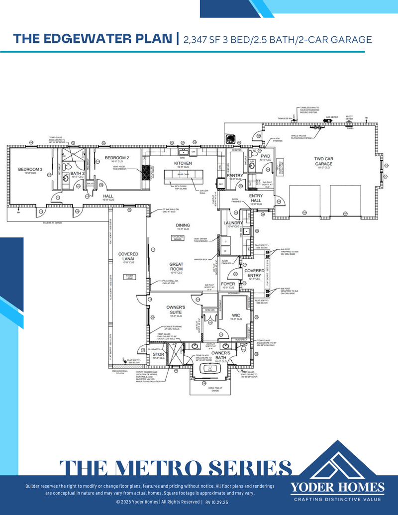 The THE EDGEWATER floor plan features 3 bedrooms, 2 bathrooms and it has 2,347 square feet. This 1 story Casa floor plan starts at $939,000 and it offers 2 car garage. YODER HOMES - BOYL offers the THE EDGEWATER floor plan and many other floor plans to choose from in order to best suit your needs. The THE EDGEWATER floor plan is definitely a good home option for you and your family.