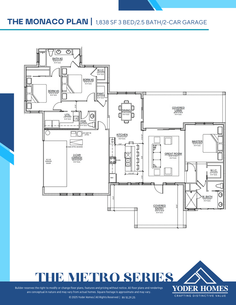 The THE MONACO floor plan features 3 bedrooms, 2 bathrooms and it has 1,838 square feet. This 1 story Casa floor plan starts at $735,000 and it offers 2 car garage. YODER HOMES - BOYL offers the THE MONACO floor plan and many other floor plans to choose from in order to best suit your needs. The THE MONACO floor plan is definitely a good home option for you and your family.