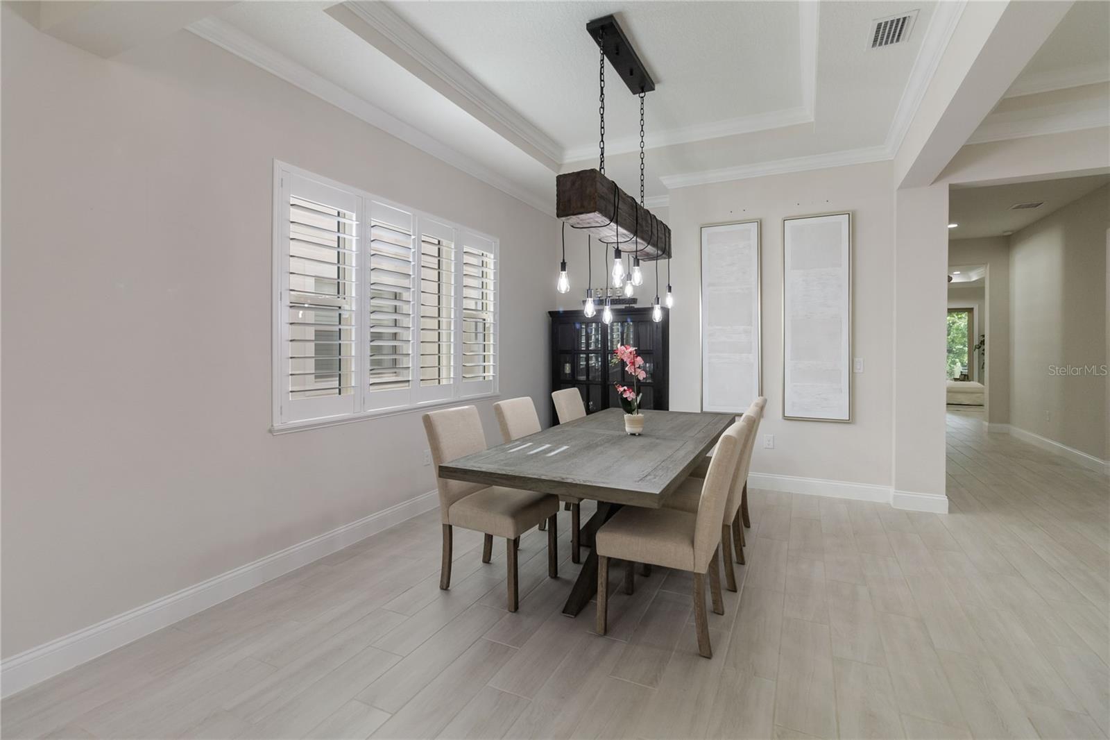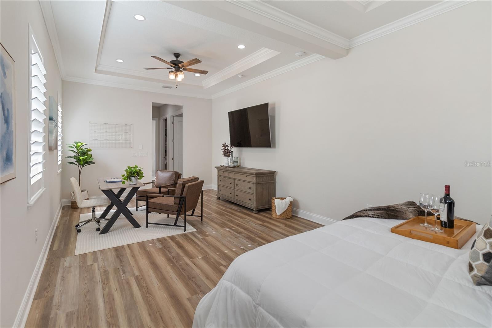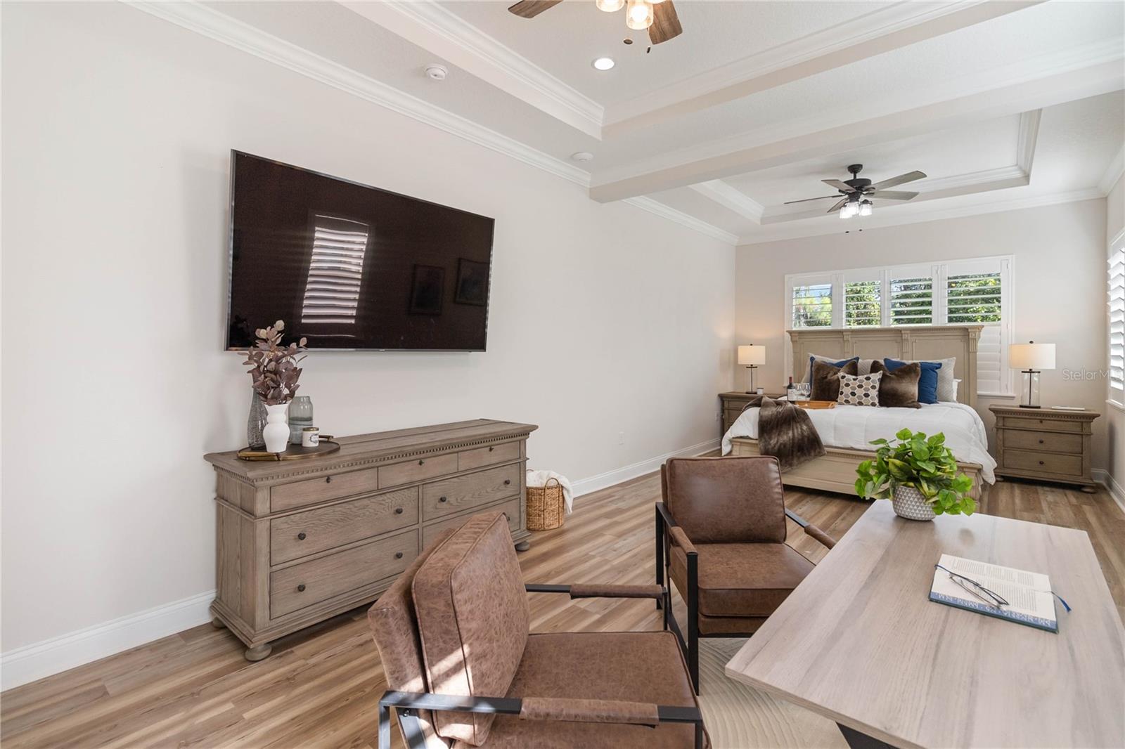 Características internas: Ceiling Fans(s), Crown Molding, Primary Bedroom Main Floor, Solid Surface Counters, Solid Wood Cabinets, Thermostat, Tray Ceiling(s), Walk-In Closet(s), Wet Bar, Window Treatments