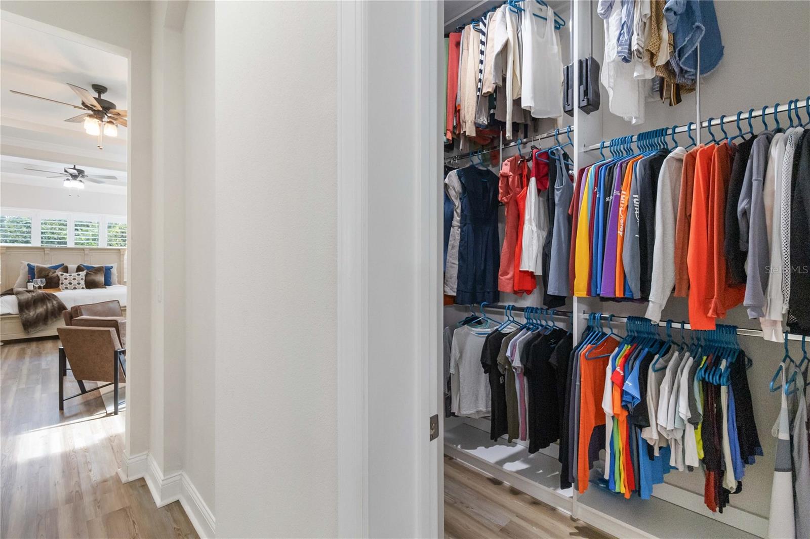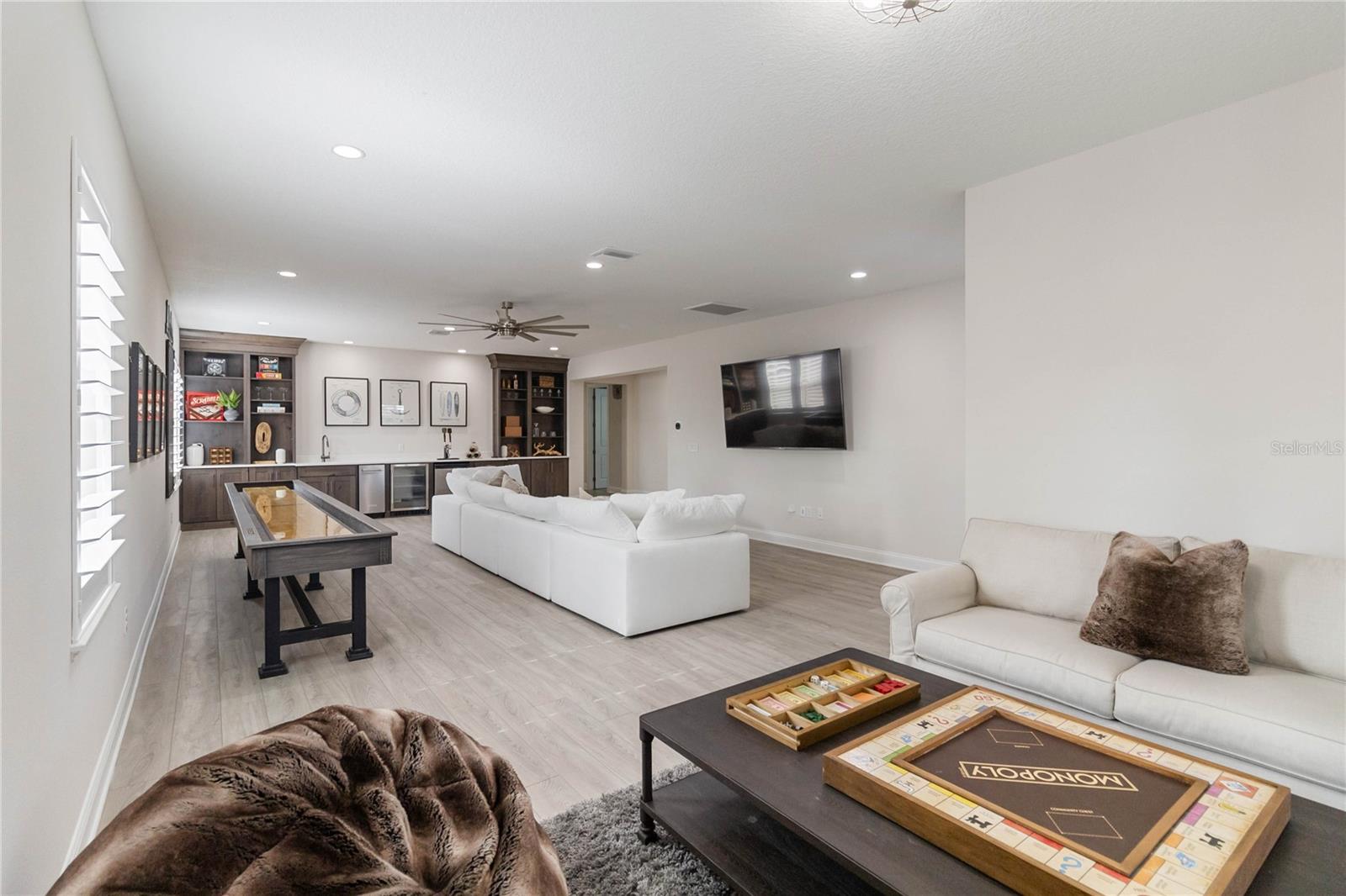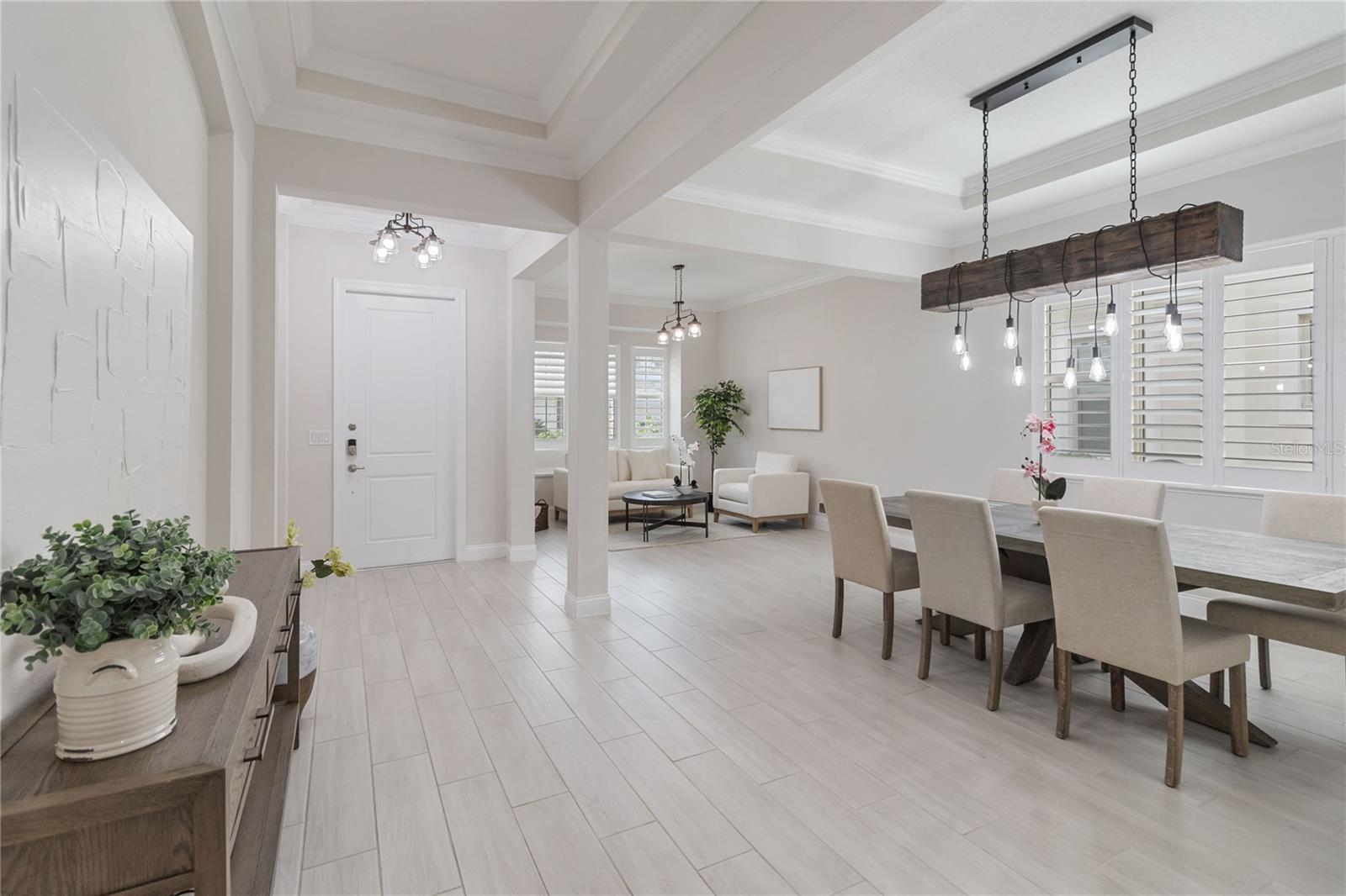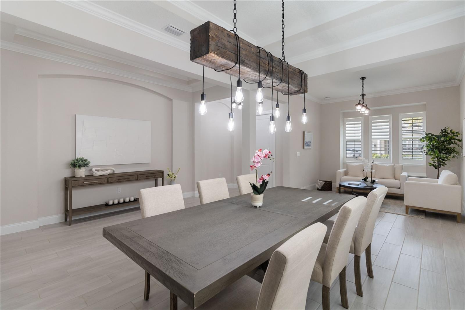 Características internas: Ceiling Fans(s), Crown Molding, Primary Bedroom Main Floor, Solid Surface Counters, Solid Wood Cabinets, Thermostat, Tray Ceiling(s), Walk-In Closet(s), Wet Bar, Window Treatments