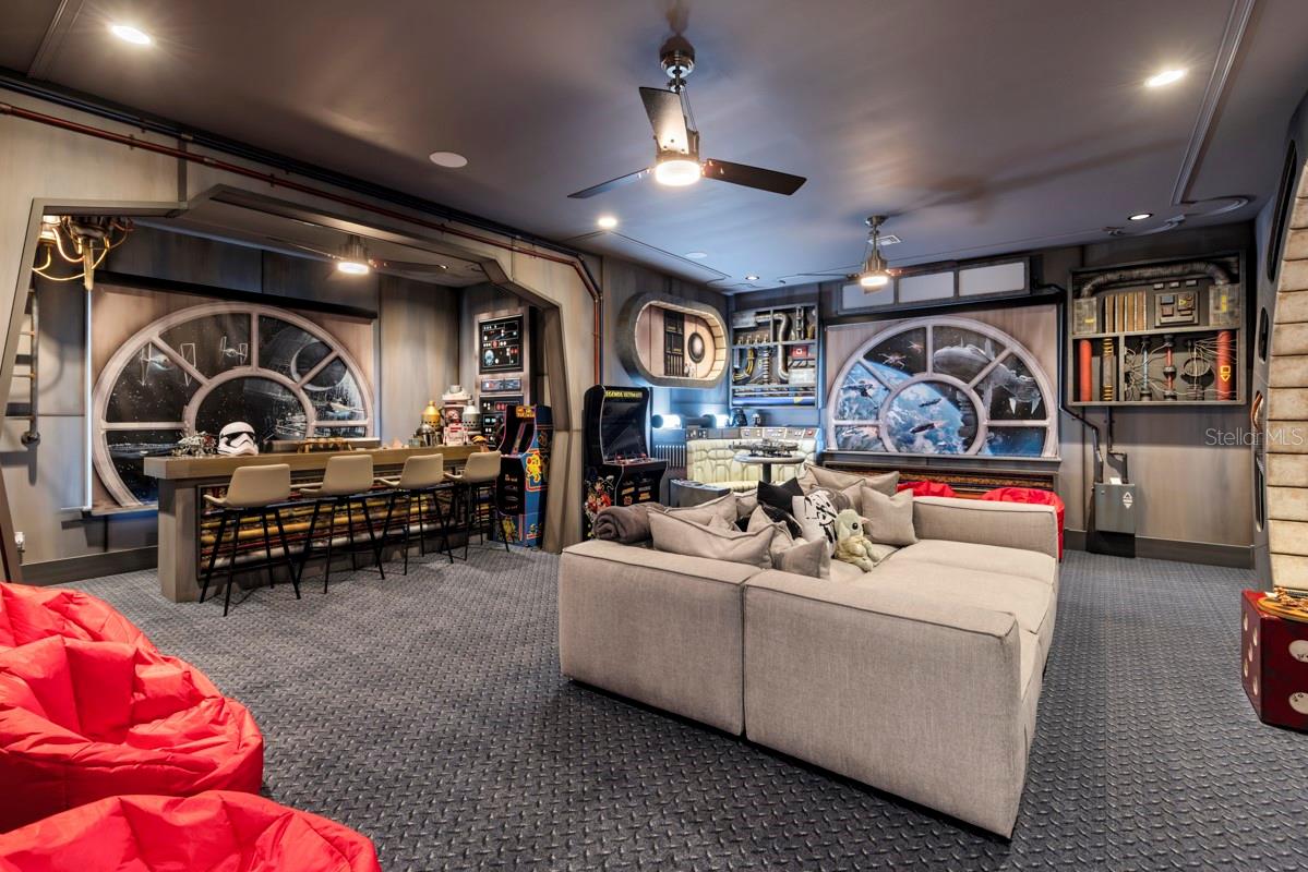 Características internas: Ceiling Fans(s), Central Vaccum, Crown Molding, Eat-in Kitchen, Elevator, High Ceilings, Kitchen/Family Room Combo, Primary Bedroom Main Floor, Solid Wood Cabinets, Stone Counters, Walk-In Closet(s), Wet Bar, Window Treatments