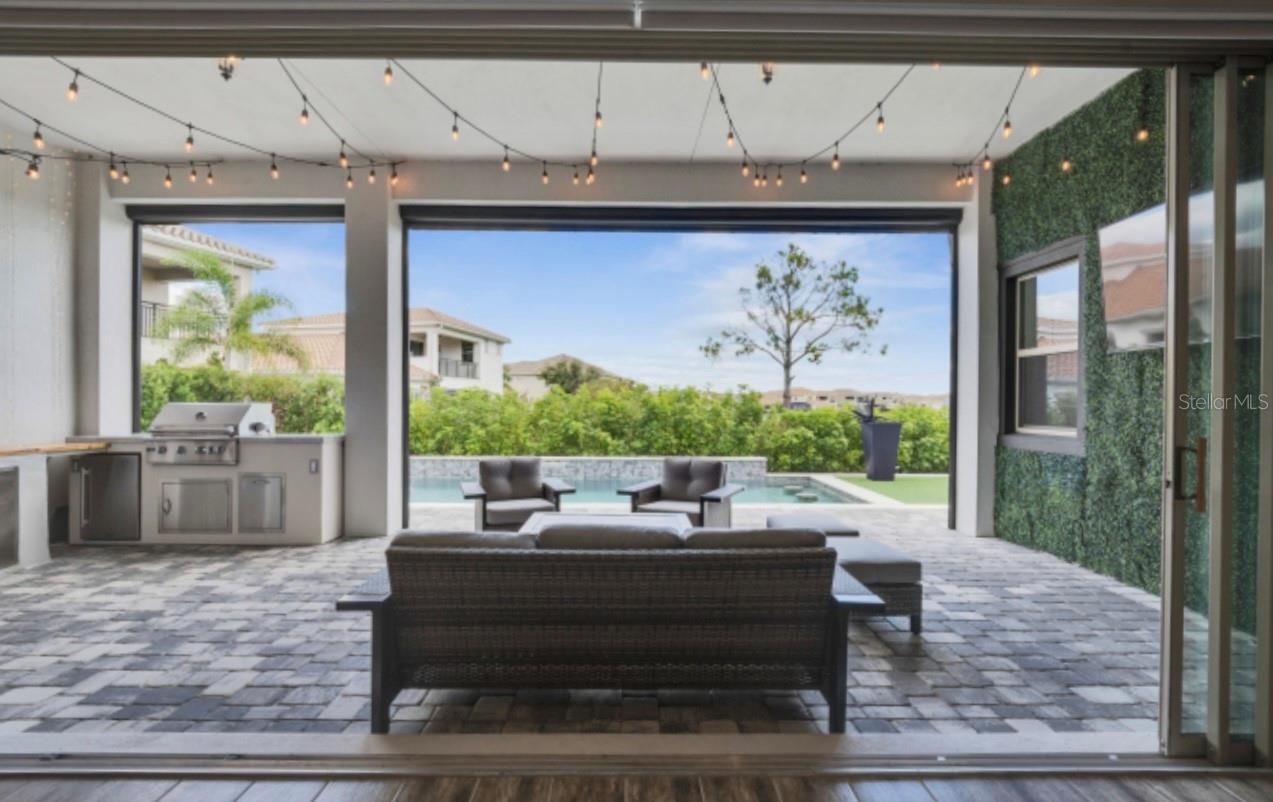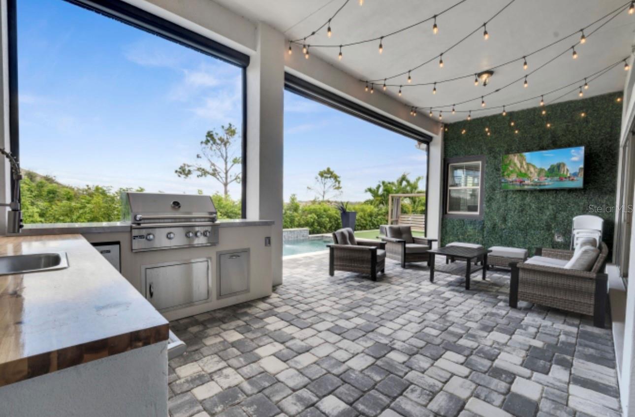 Características externas: Balcony, Outdoor Kitchen, Rain Gutters, Sidewalk, Sliding Doors