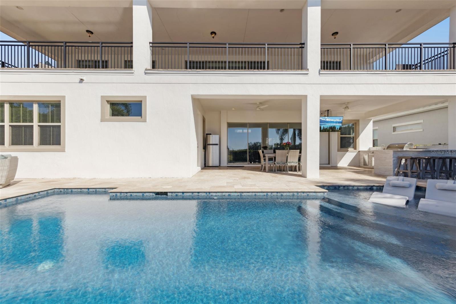 Características externas: Balcony, Outdoor Grill, Outdoor Kitchen, Private Mailbox, Rain Gutters, Sidewalk, Sliding Doors