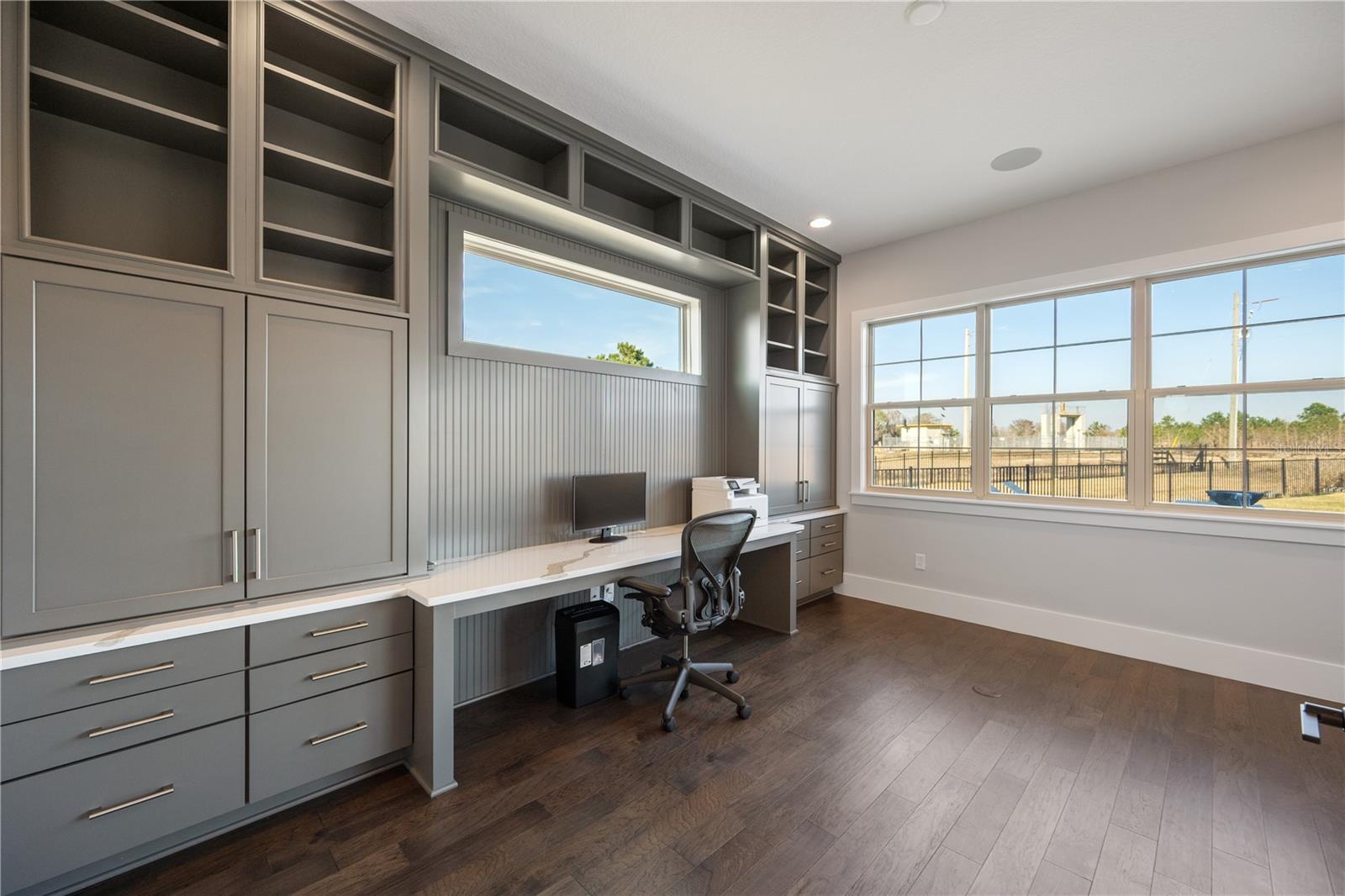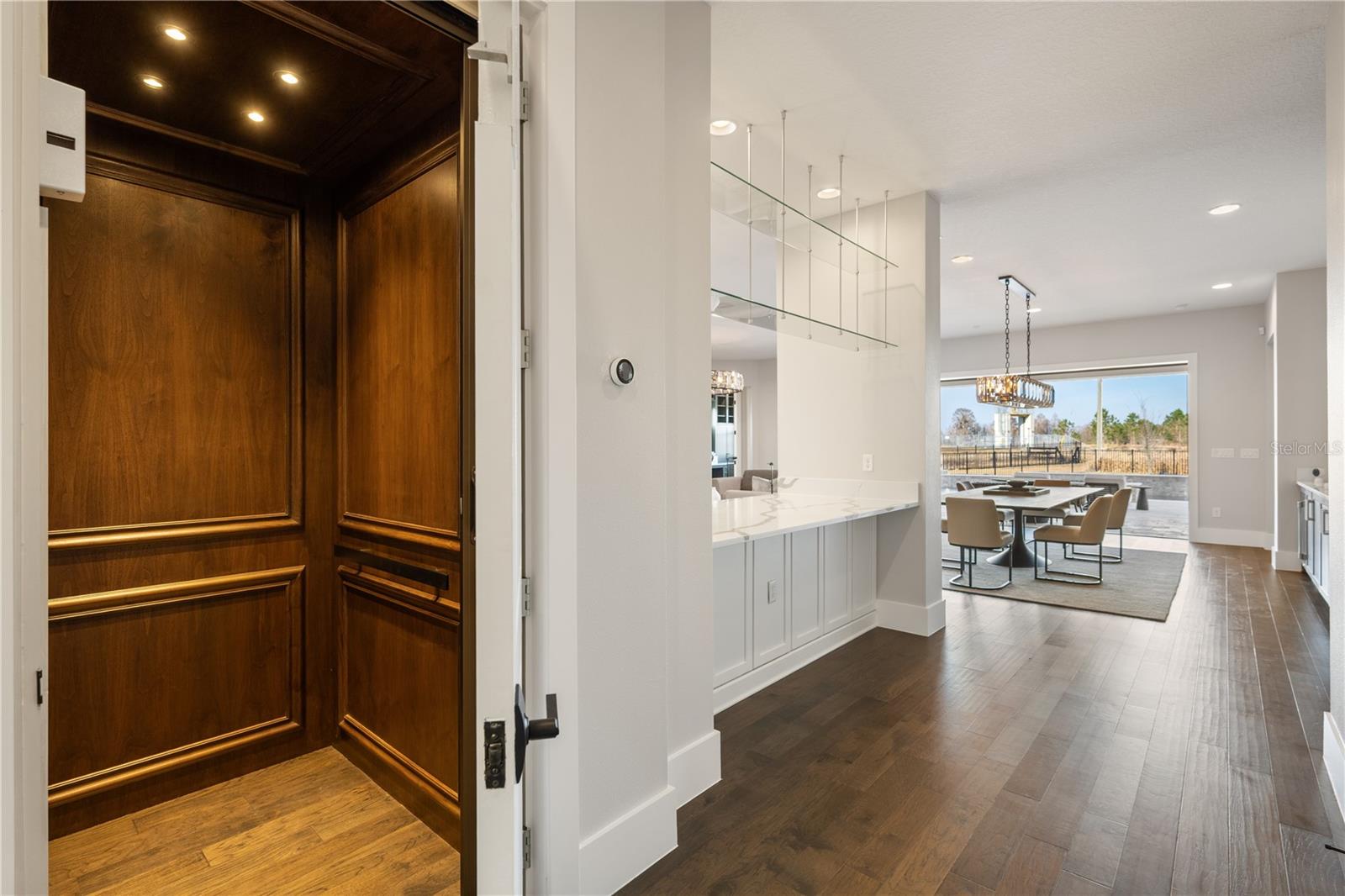 Características internas: Built-in Features, Ceiling Fans(s), Dry Bar, Eat-in Kitchen, Elevator, High Ceilings, Kitchen/Family Room Combo, Living Room/Dining Room Combo, Open Floorplan, Primary Bedroom Main Floor, Solid Wood Cabinets, Split Bedroom, Stone Counters, Thermostat, Tray Ceiling(s), Walk-In Closet(s)