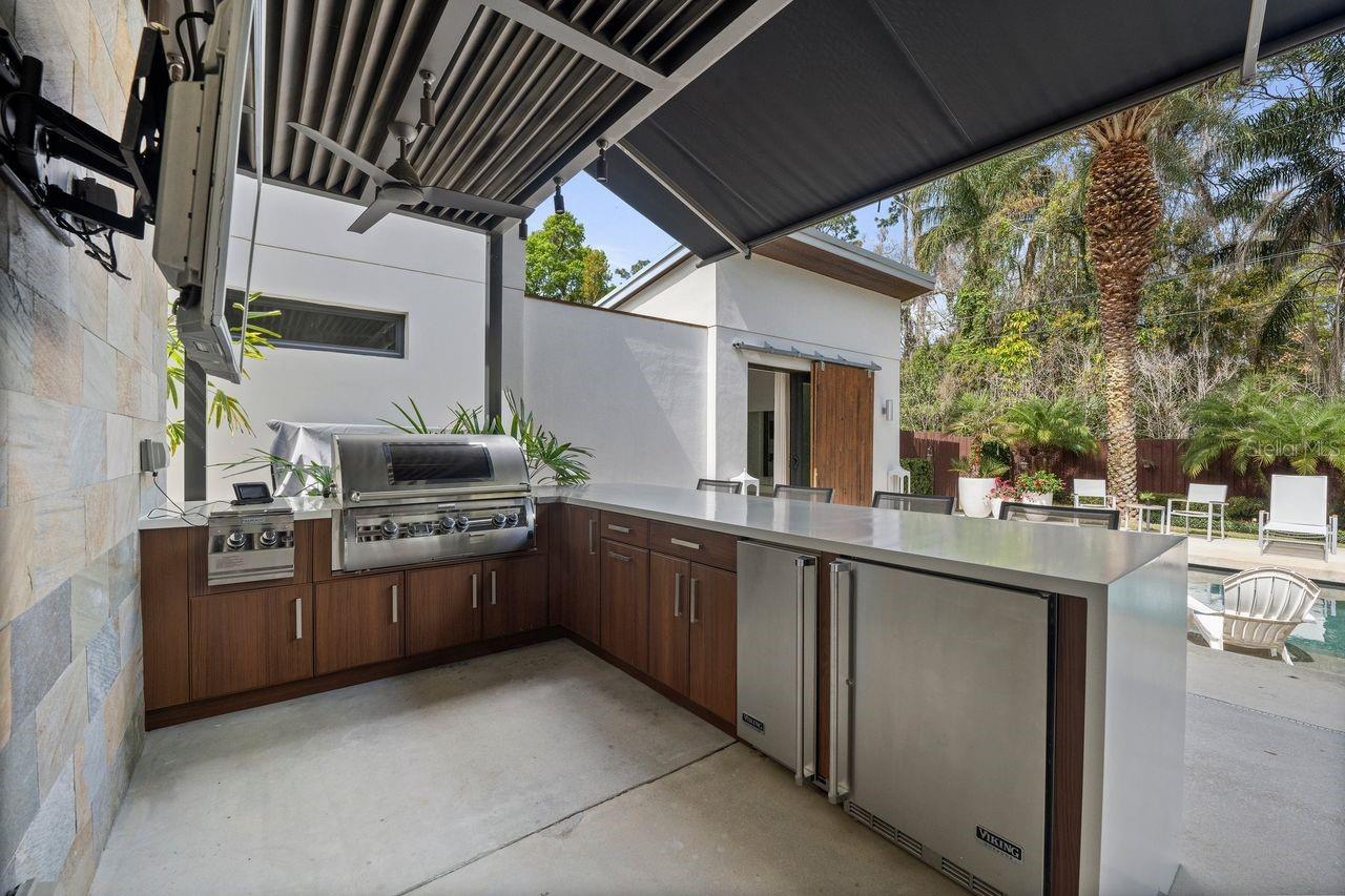 Características externas: Awning(s), Balcony, Lighting, Outdoor Grill, Outdoor Kitchen, Outdoor Shower, Rain Gutters, Sidewalk, Sliding Doors