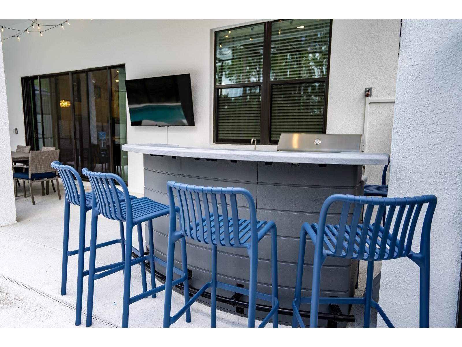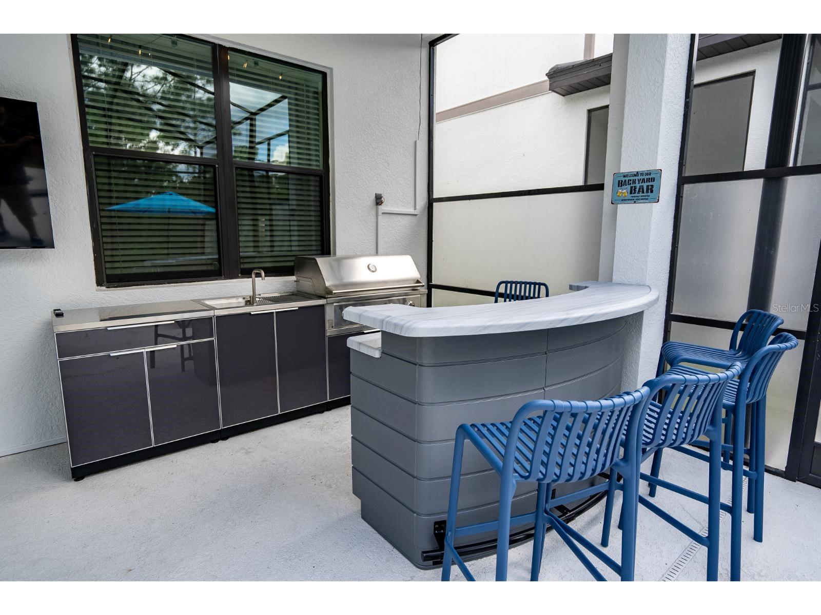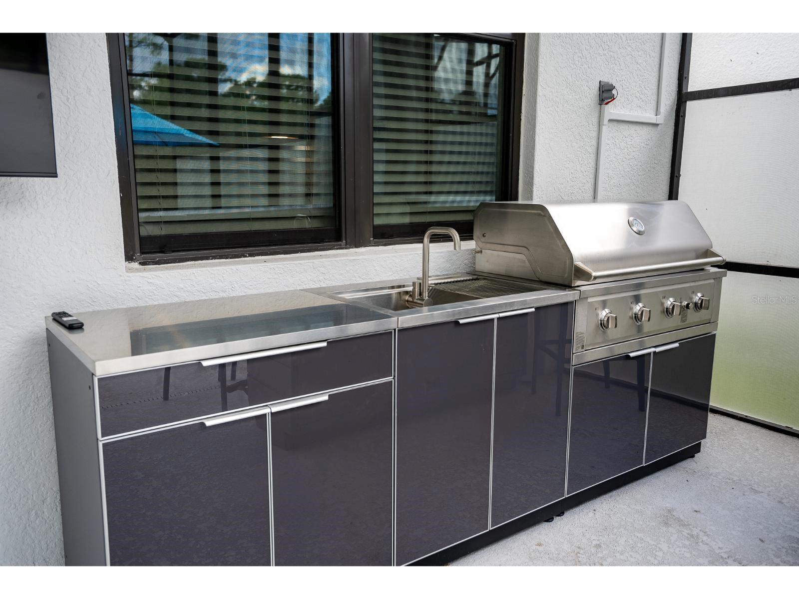 Características externas: Outdoor Kitchen, Rain Gutters, Sidewalk