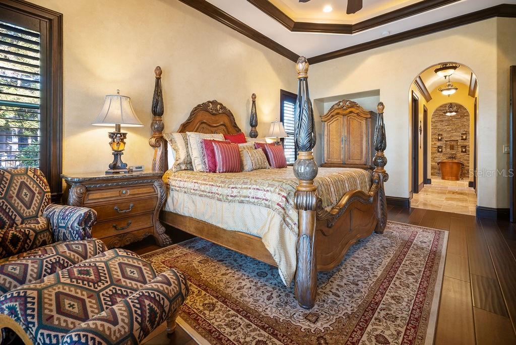 Características internas: Cathedral Ceiling(s), Ceiling Fans(s), Coffered Ceiling(s), Crown Molding, Eat-in Kitchen, High Ceilings, In Wall Pest System, Kitchen/Family Room Combo, Open Floorplan, Primary Bedroom Main Floor, Solid Surface Counters, Split Bedroom, Stone Counters, Thermostat, Tray Ceiling(s), Walk-In Closet(s), Window Treatments