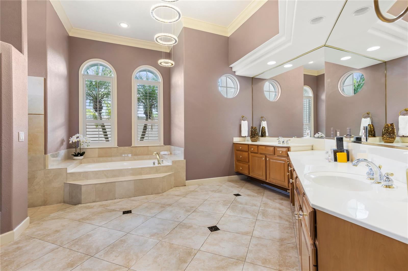 Características internas: Built-in Features, Crown Molding, Eat-in Kitchen, High Ceilings, Kitchen/Family Room Combo, Living Room/Dining Room Combo, Open Floorplan, Primary Bedroom Main Floor, Solid Wood Cabinets, Stone Counters, Thermostat, Tray Ceiling(s), Walk-In Closet(s), Wet Bar, Window Treatments