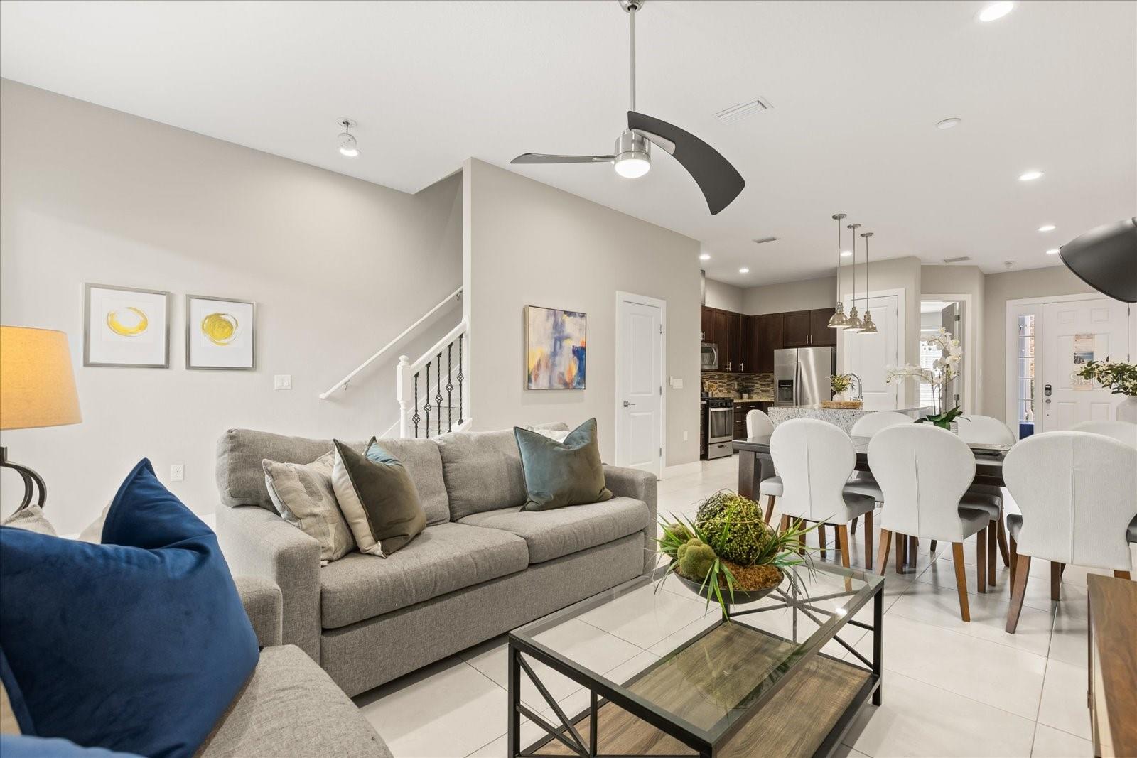 Características internas: Ceiling Fans(s), Eat-in Kitchen, High Ceilings, Kitchen/Family Room Combo, Living Room/Dining Room Combo, Open Floorplan, PrimaryBedroom Upstairs, Solid Surface Counters, Thermostat, Walk-In Closet(s), Window Treatments