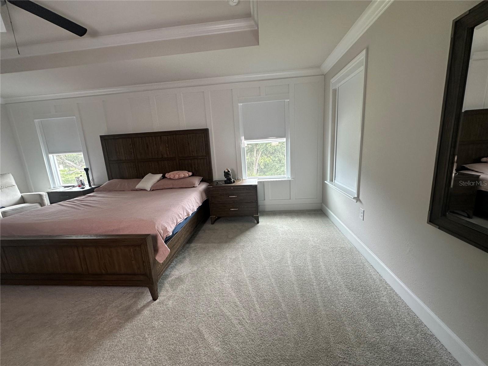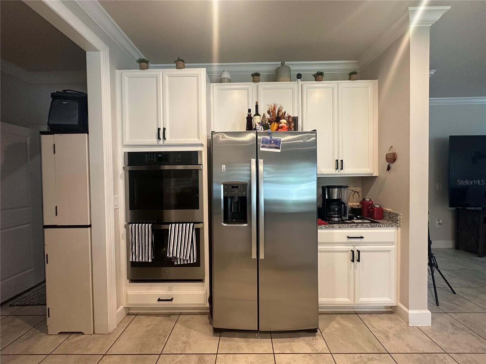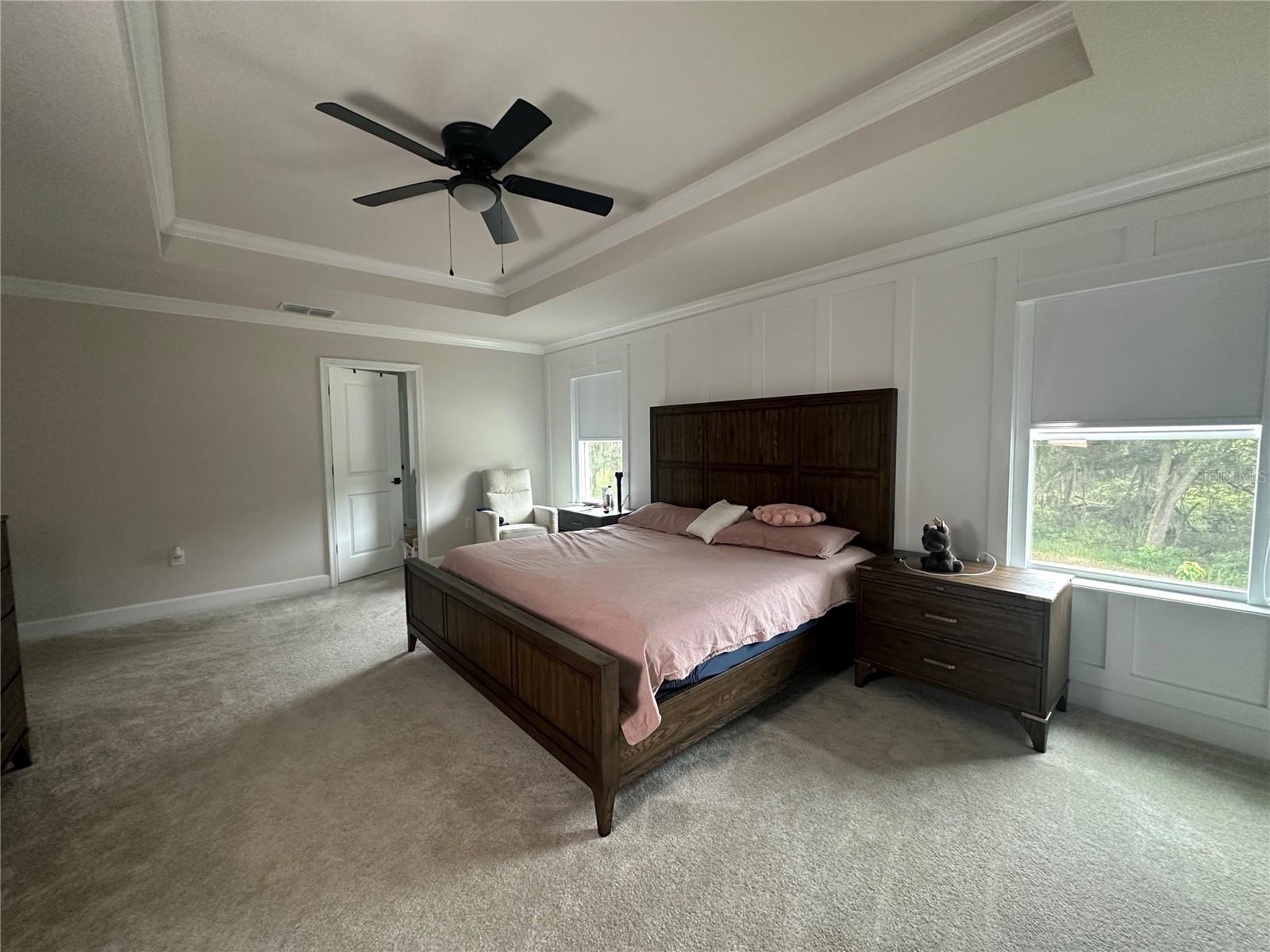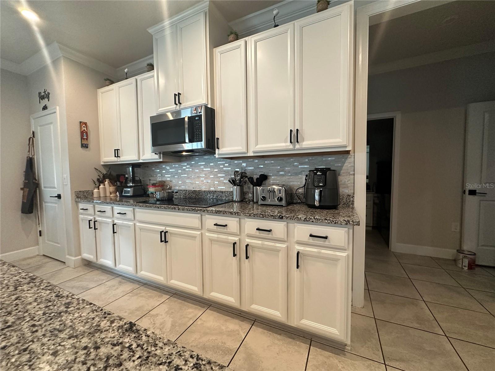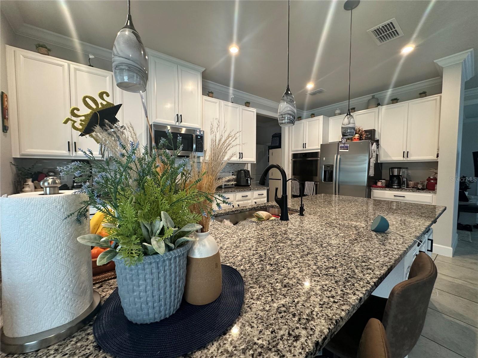 Características internas: Eat-in Kitchen, Kitchen/Family Room Combo, PrimaryBedroom Upstairs, Solid Surface Counters, Split Bedroom, Stone Counters, Thermostat, Tray Ceiling(s), Walk-In Closet(s)