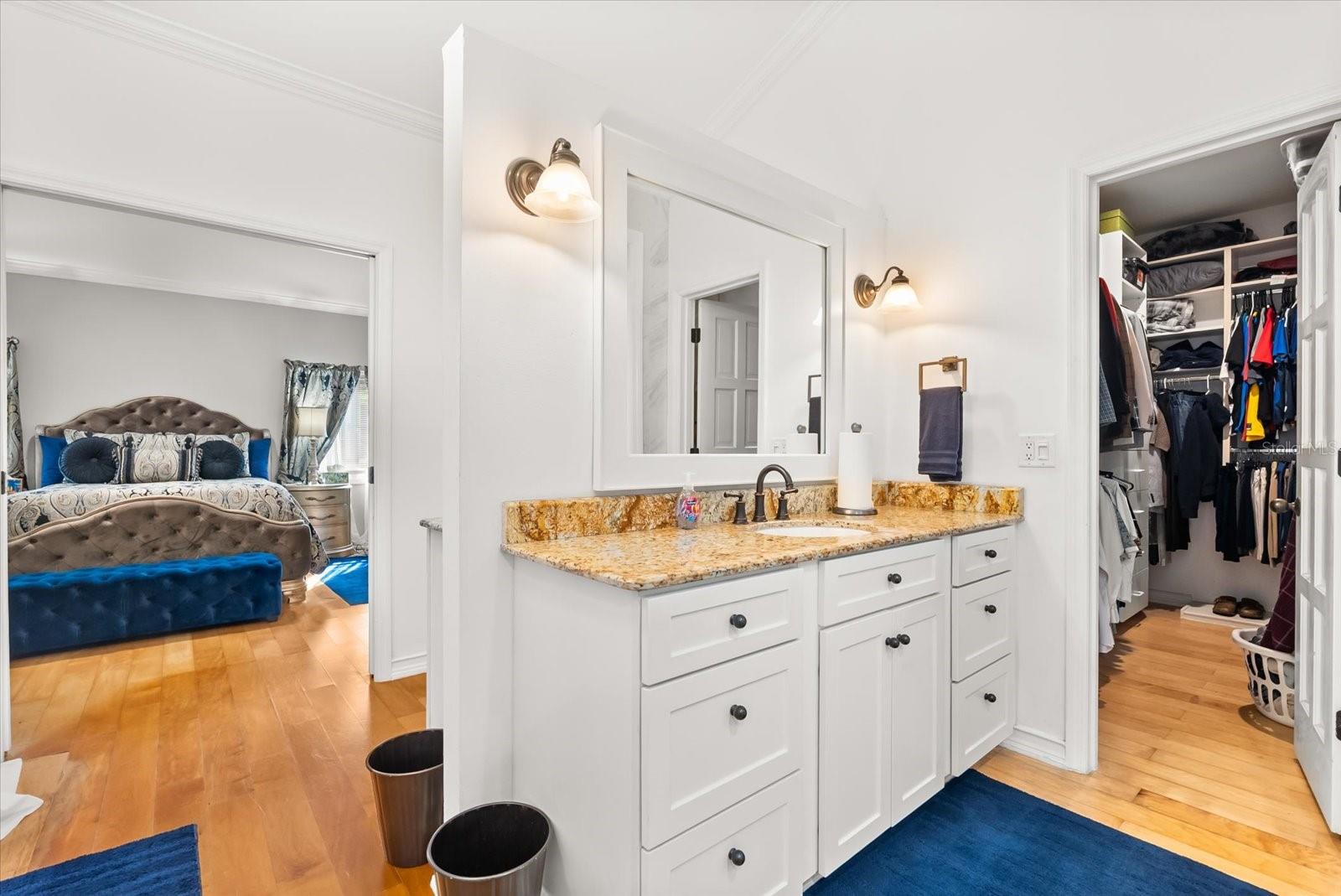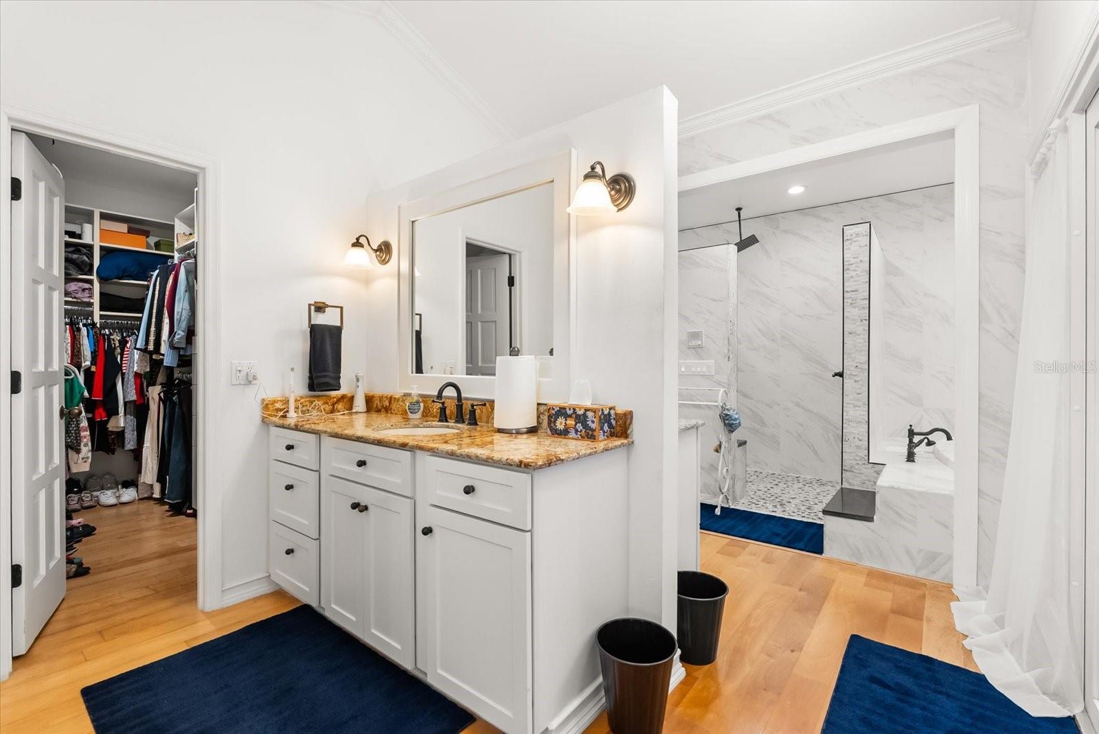 Características internas: Ceiling Fans(s), Coffered Ceiling(s), Crown Molding, High Ceilings, Open Floorplan, Other, Primary Bedroom Main Floor, Solid Surface Counters, Solid Wood Cabinets, Stone Counters, Vaulted Ceiling(s), Walk-In Closet(s)