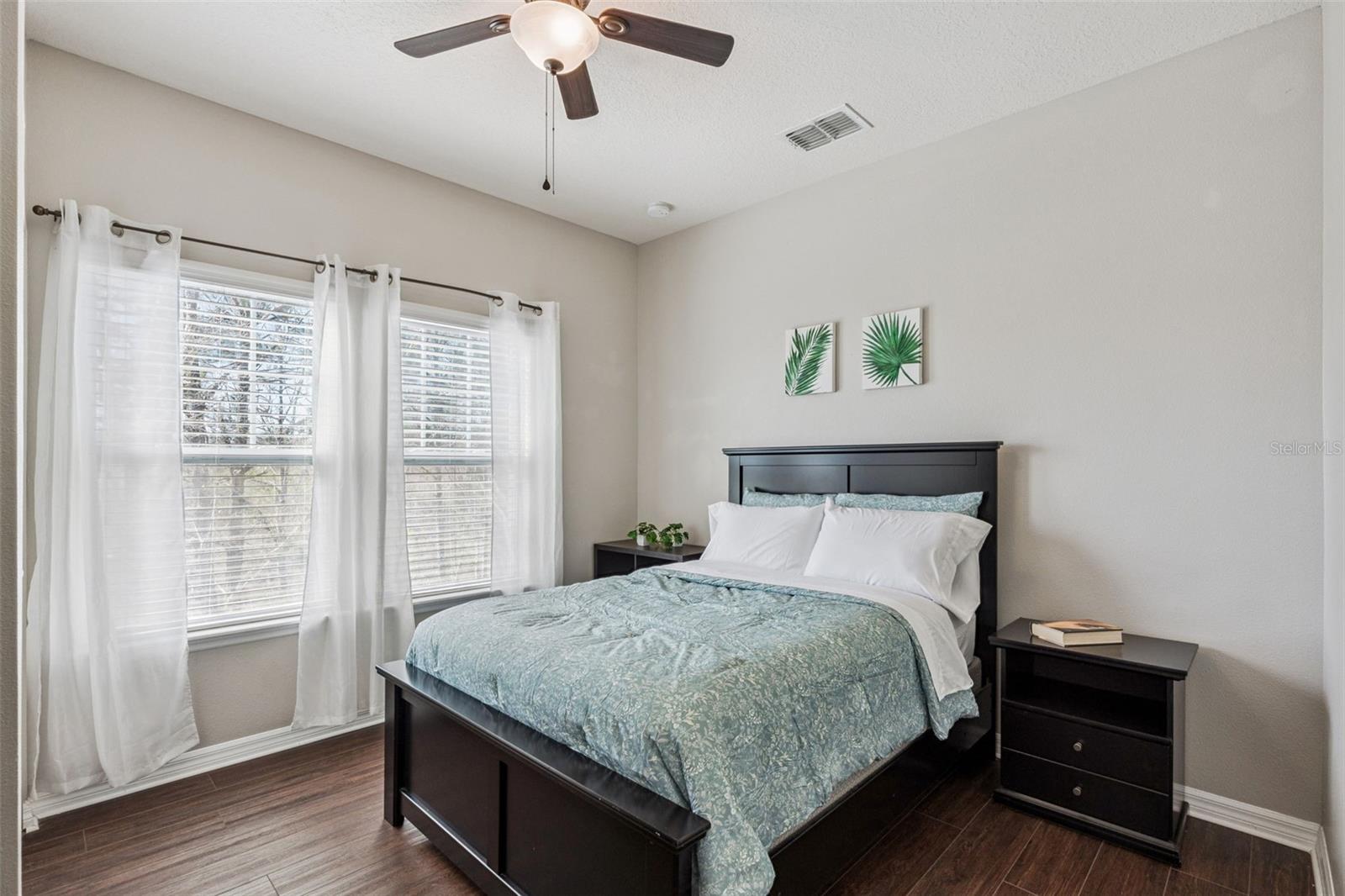 Características internas: Ceiling Fans(s), High Ceilings, Living Room/Dining Room Combo, Primary Bedroom Main Floor, PrimaryBedroom Upstairs, Solid Surface Counters, Split Bedroom, Stone Counters, Thermostat, Walk-In Closet(s), Window Treatments