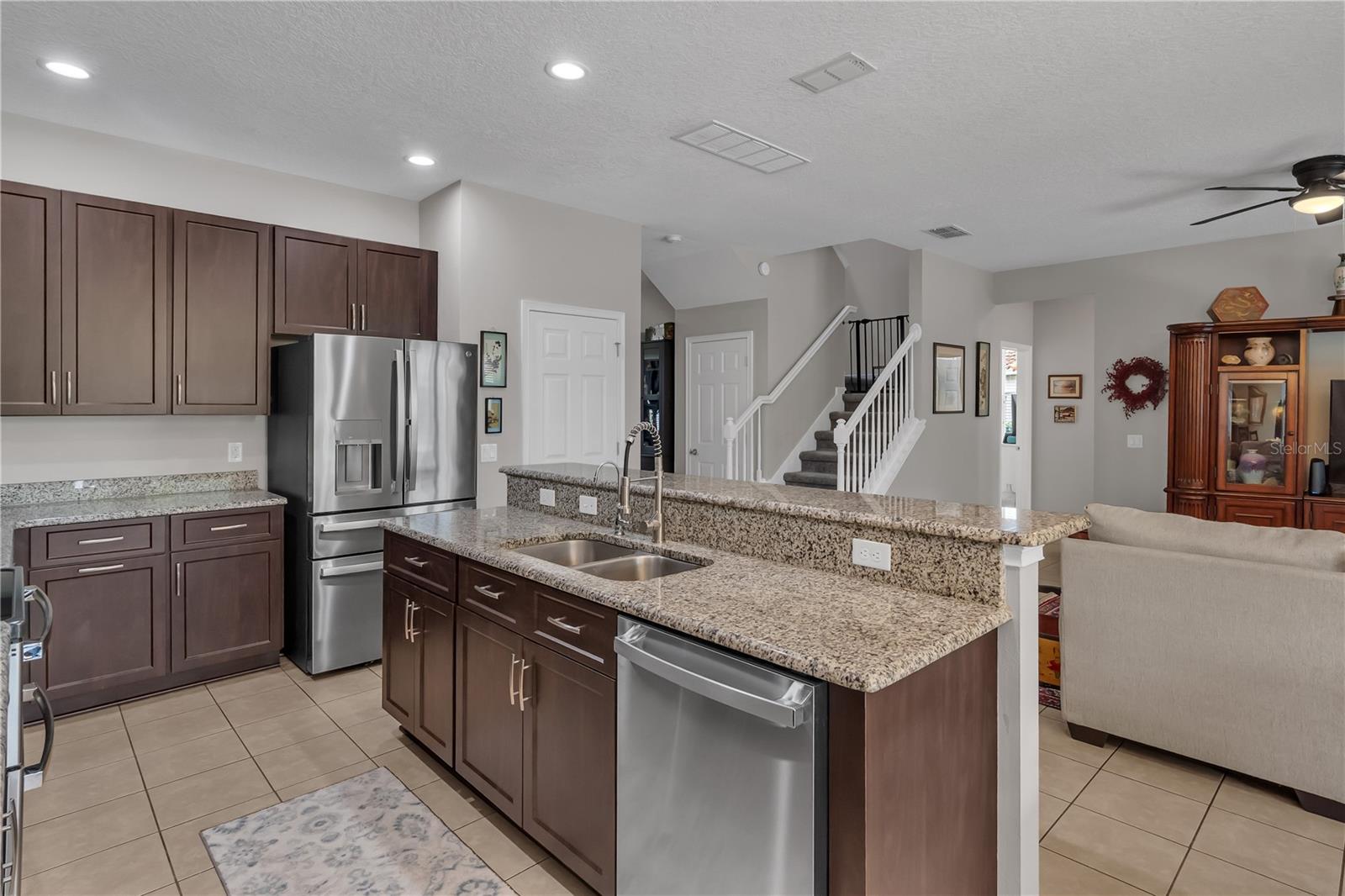 Características internas: Ceiling Fans(s), Living Room/Dining Room Combo, Open Floorplan, PrimaryBedroom Upstairs, Solid Surface Counters, Solid Wood Cabinets, Split Bedroom, Stone Counters, Thermostat, Walk-In Closet(s), Window Treatments
