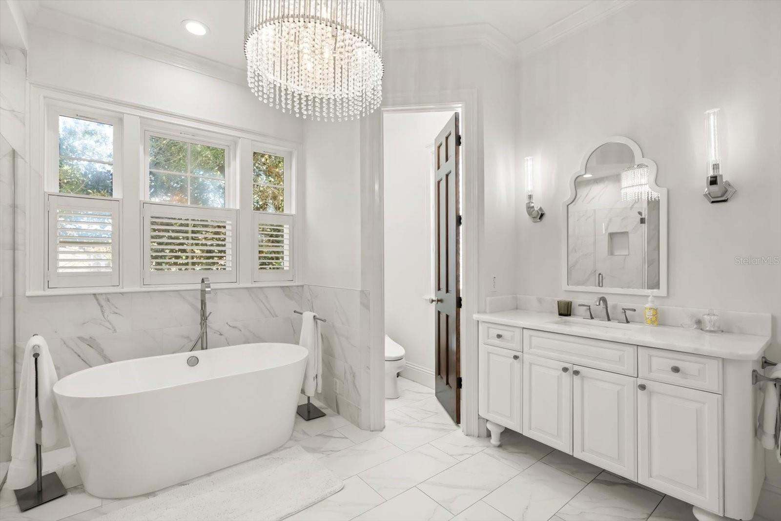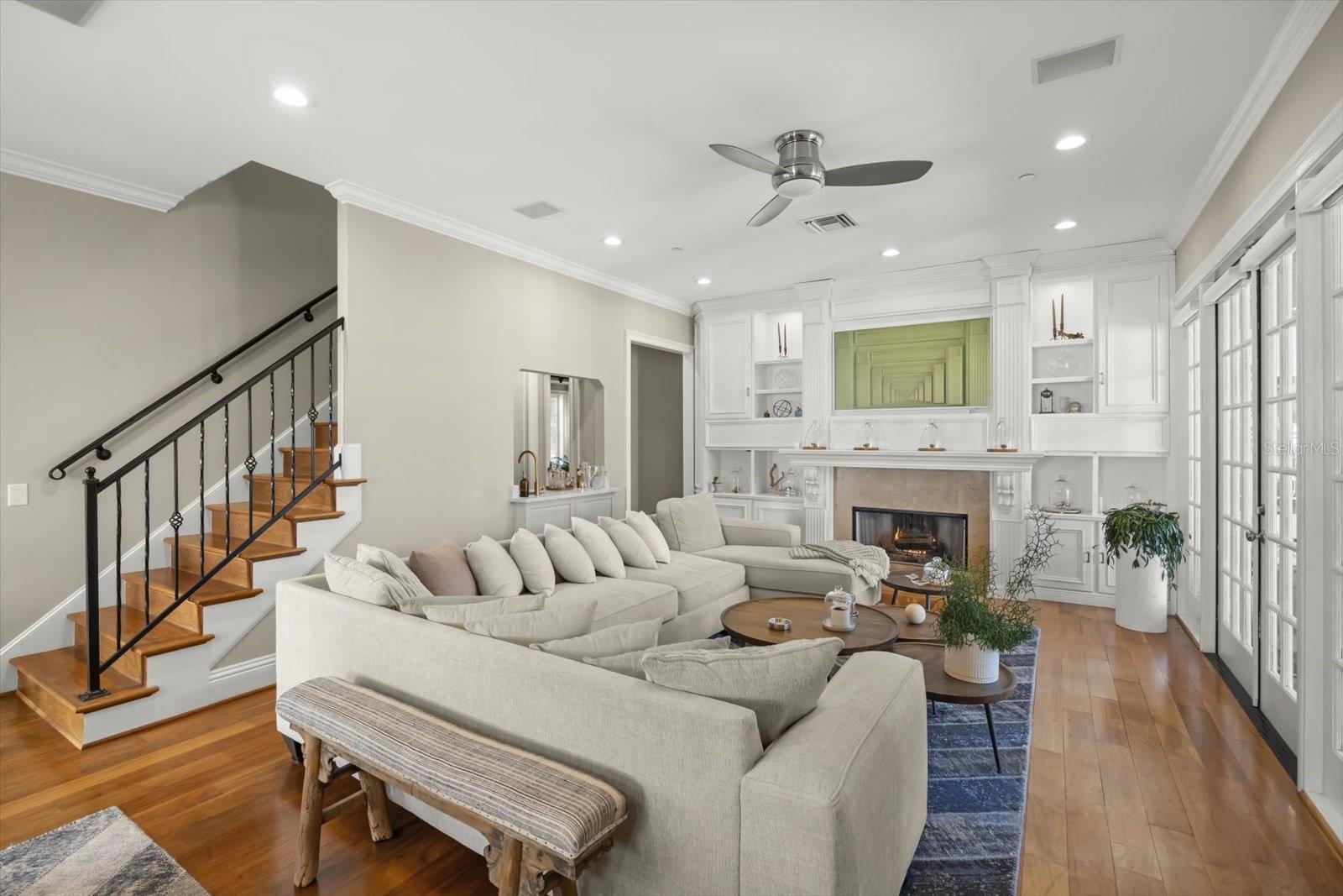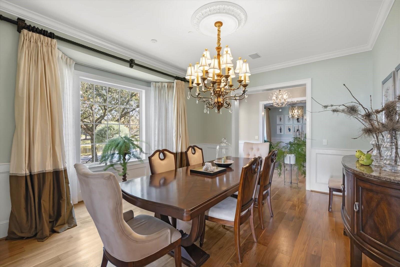 Características internas: Built-in Features, Ceiling Fans(s), Crown Molding, Dry Bar, Eat-in Kitchen, High Ceilings, Kitchen/Family Room Combo, Primary Bedroom Main Floor, Solid Surface Counters, Solid Wood Cabinets, Walk-In Closet(s), Wet Bar, Window Treatments