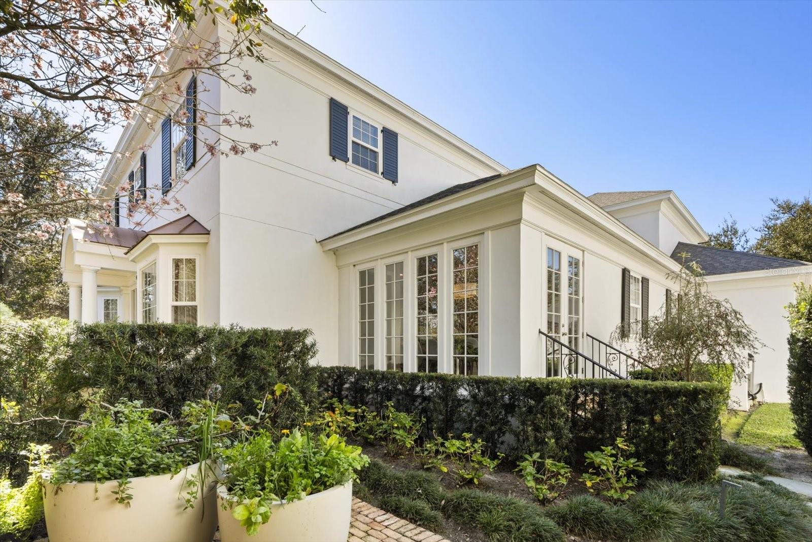 Características externas: Balcony, French Doors, Garden, Lighting, Outdoor Kitchen, Private Entrance, Private Yard, Rain Gutters, Sidewalk