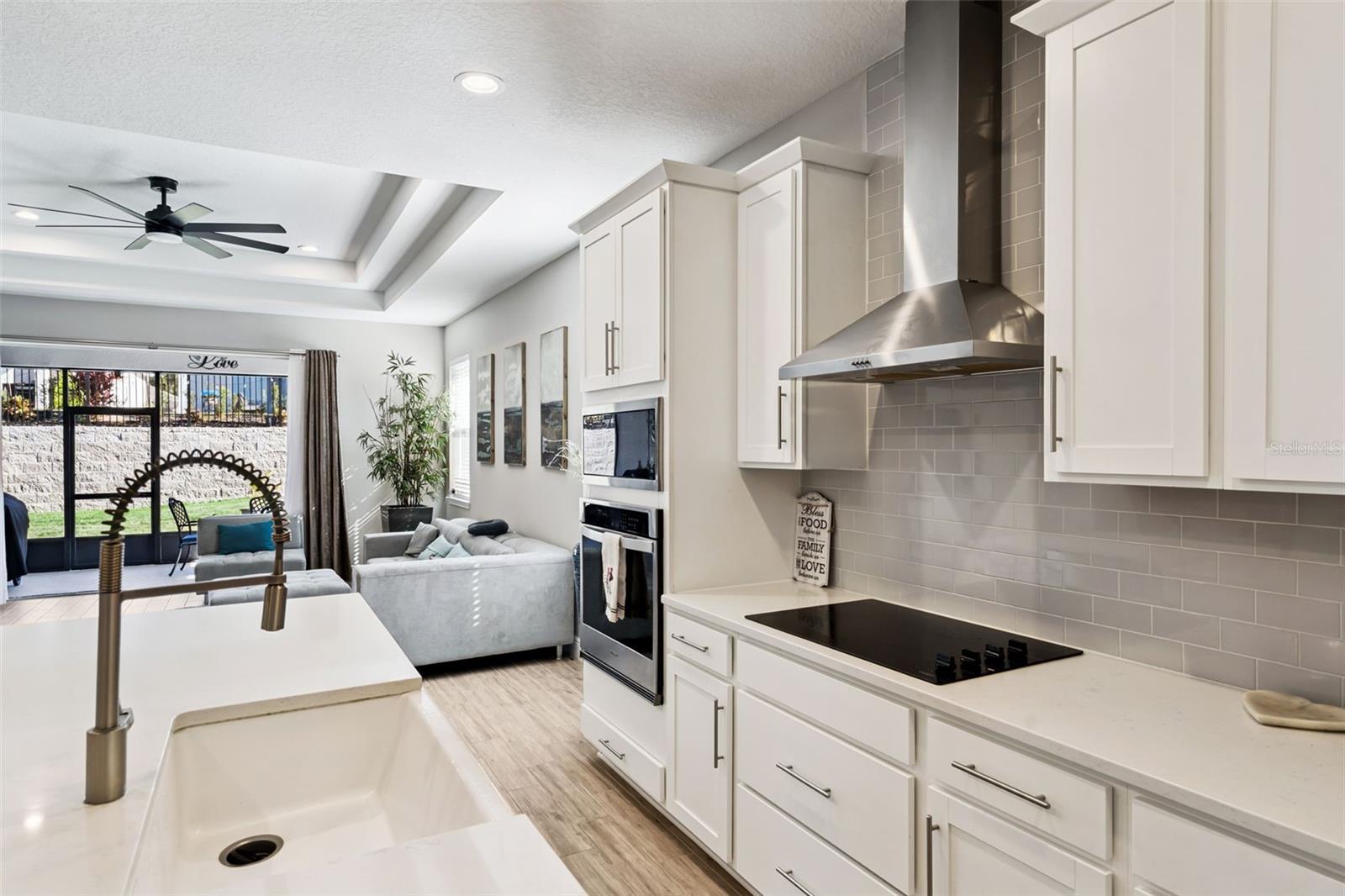 Características internas: Accessibility Features, Ceiling Fans(s), Coffered Ceiling(s), Eat-in Kitchen, High Ceilings, Kitchen/Family Room Combo, Open Floorplan, Primary Bedroom Main Floor, Split Bedroom, Stone Counters, Thermostat, Tray Ceiling(s), Vaulted Ceiling(s), Walk-In Closet(s)