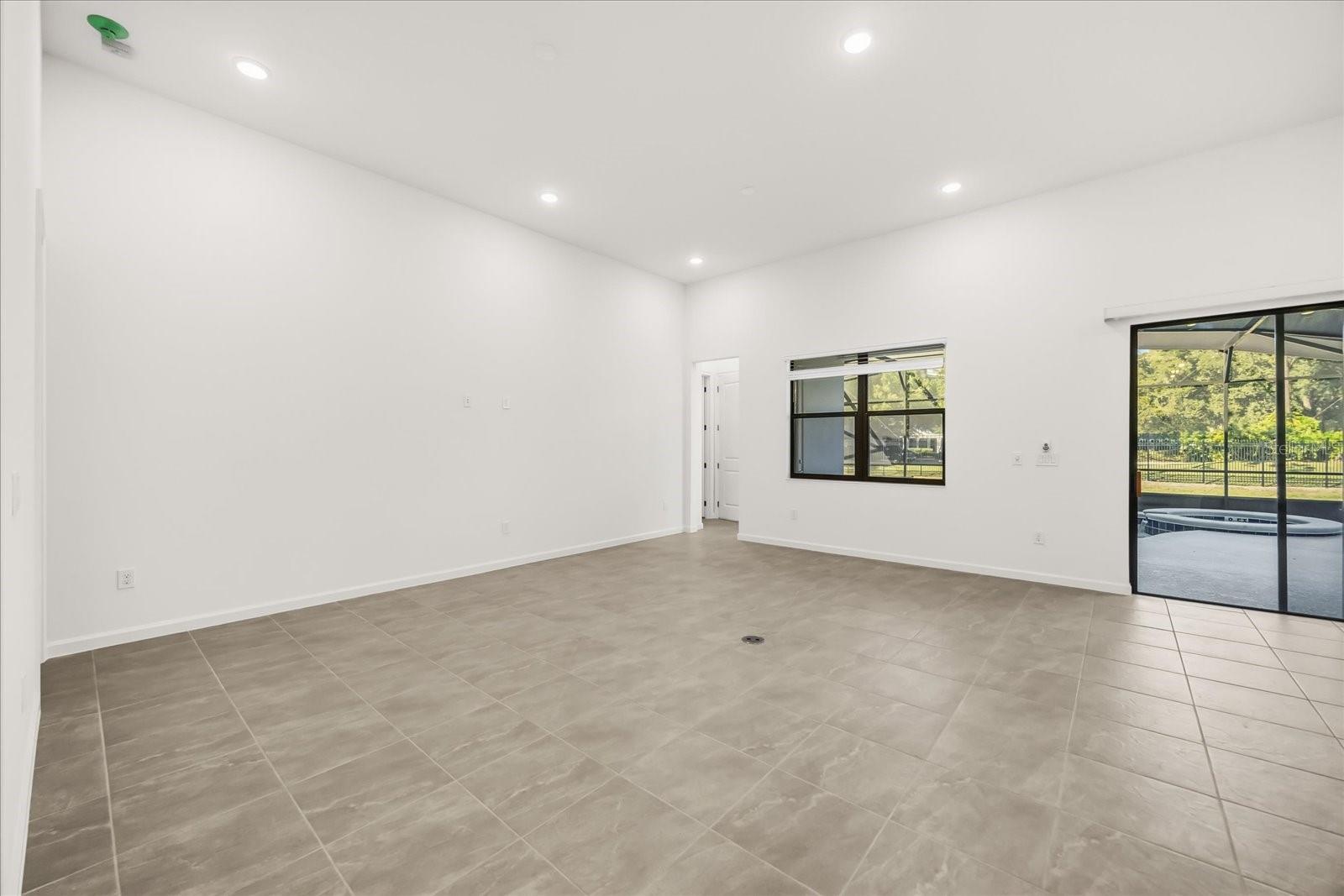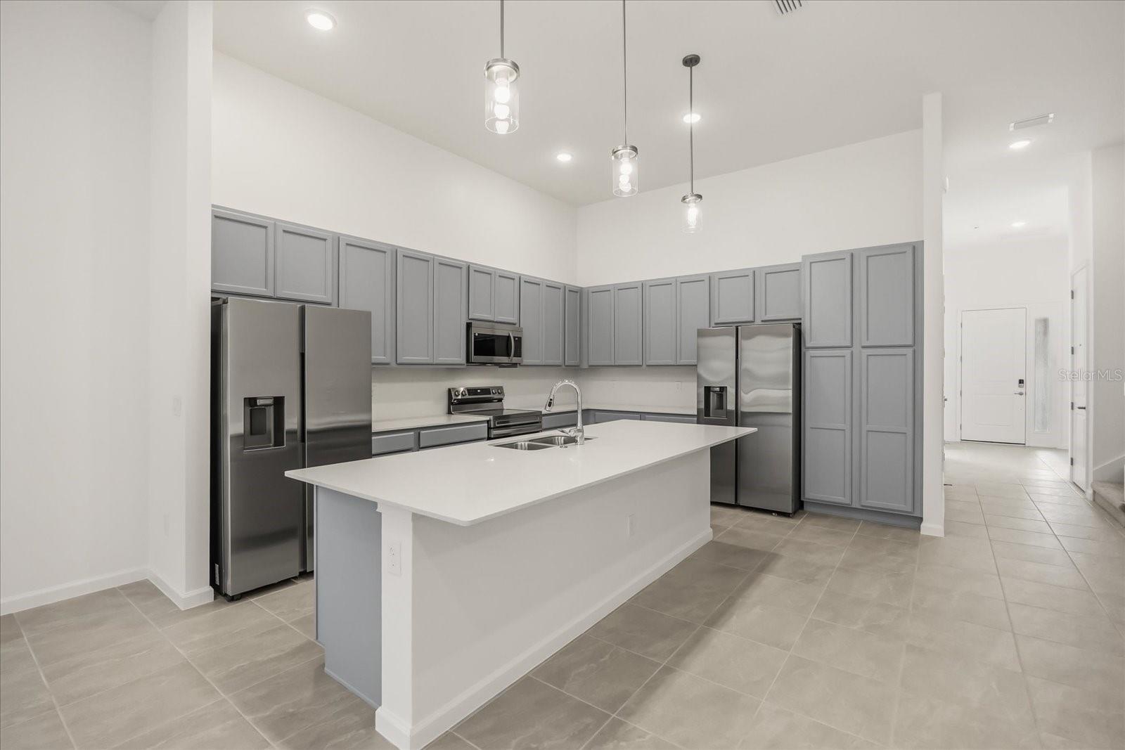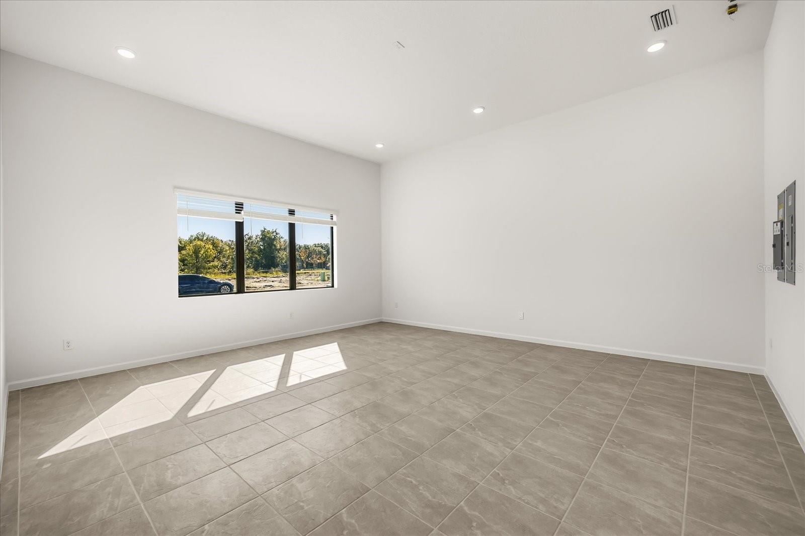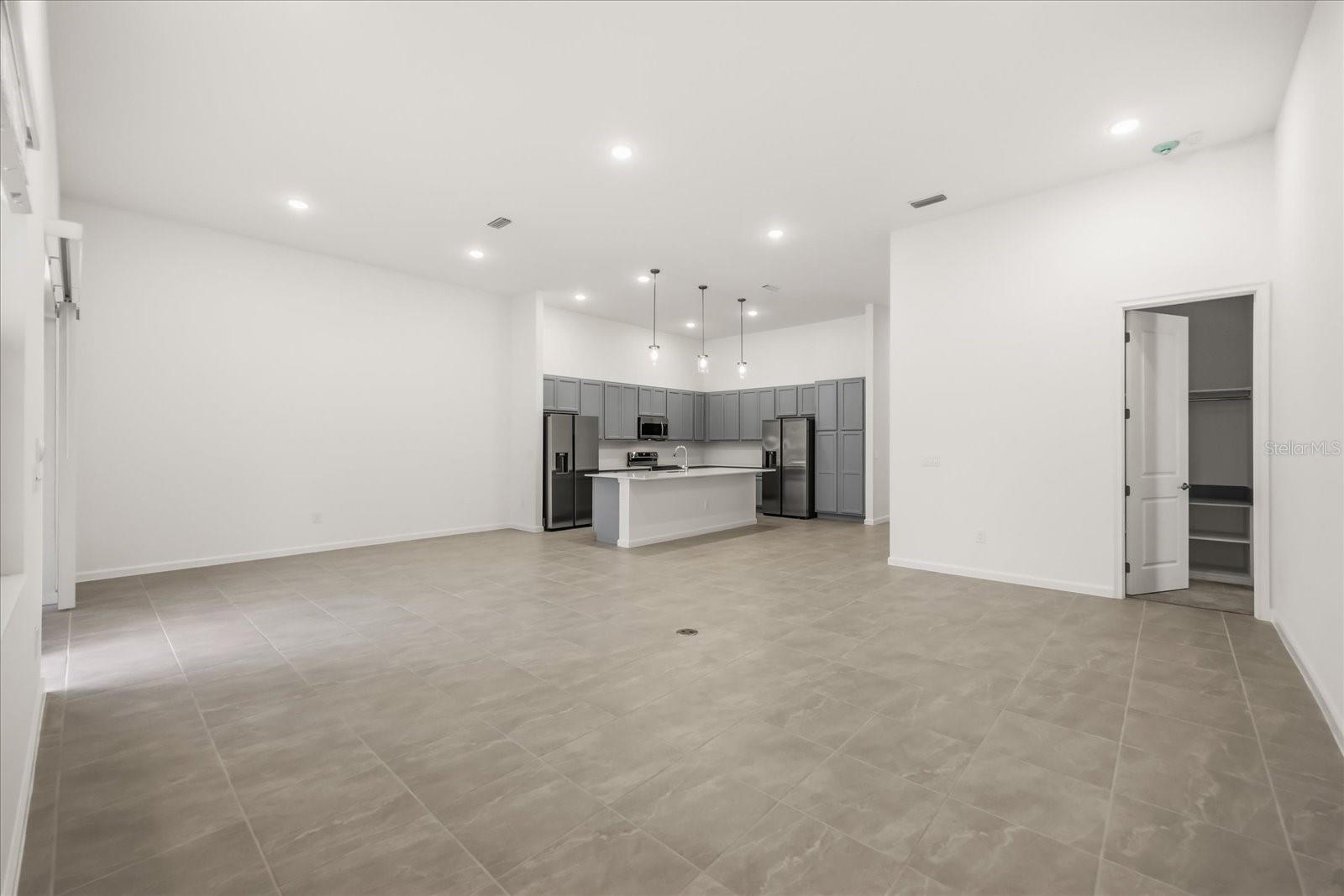 Características internas: High Ceilings, Kitchen/Family Room Combo, Living Room/Dining Room Combo, Open Floorplan, Primary Bedroom Main Floor, Stone Counters, Thermostat, Walk-In Closet(s)