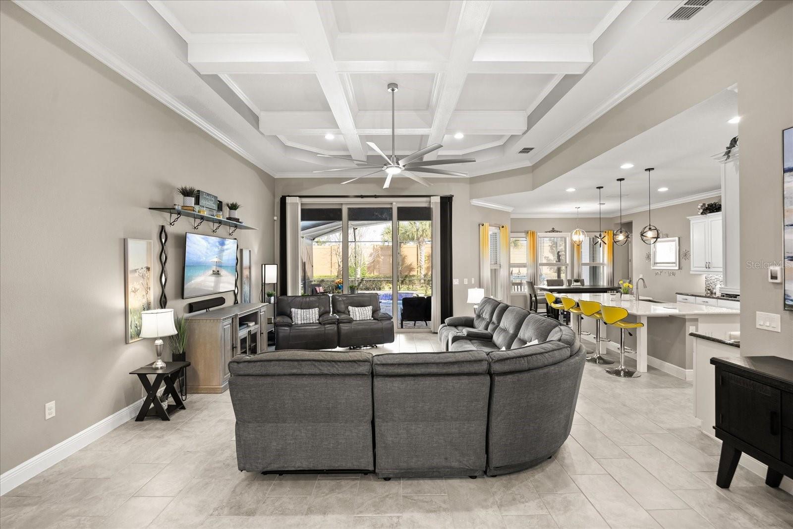 Características internas: Ceiling Fans(s), Crown Molding, Eat-in Kitchen, Kitchen/Family Room Combo, Open Floorplan, Primary Bedroom Main Floor, Thermostat, Tray Ceiling(s), Walk-In Closet(s)