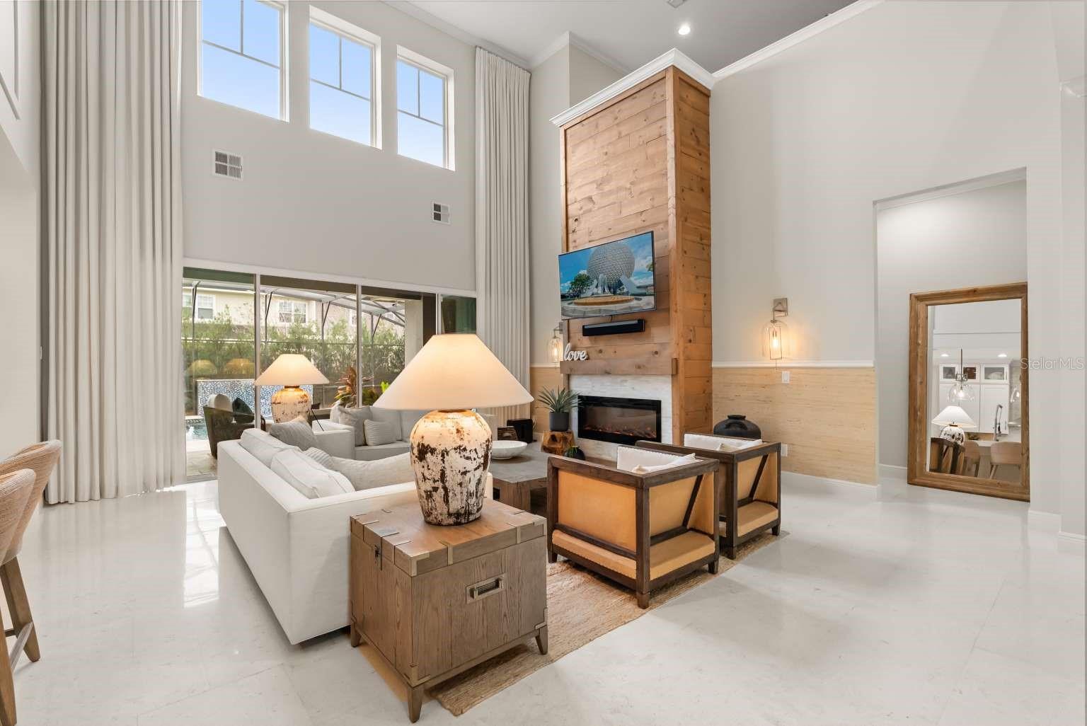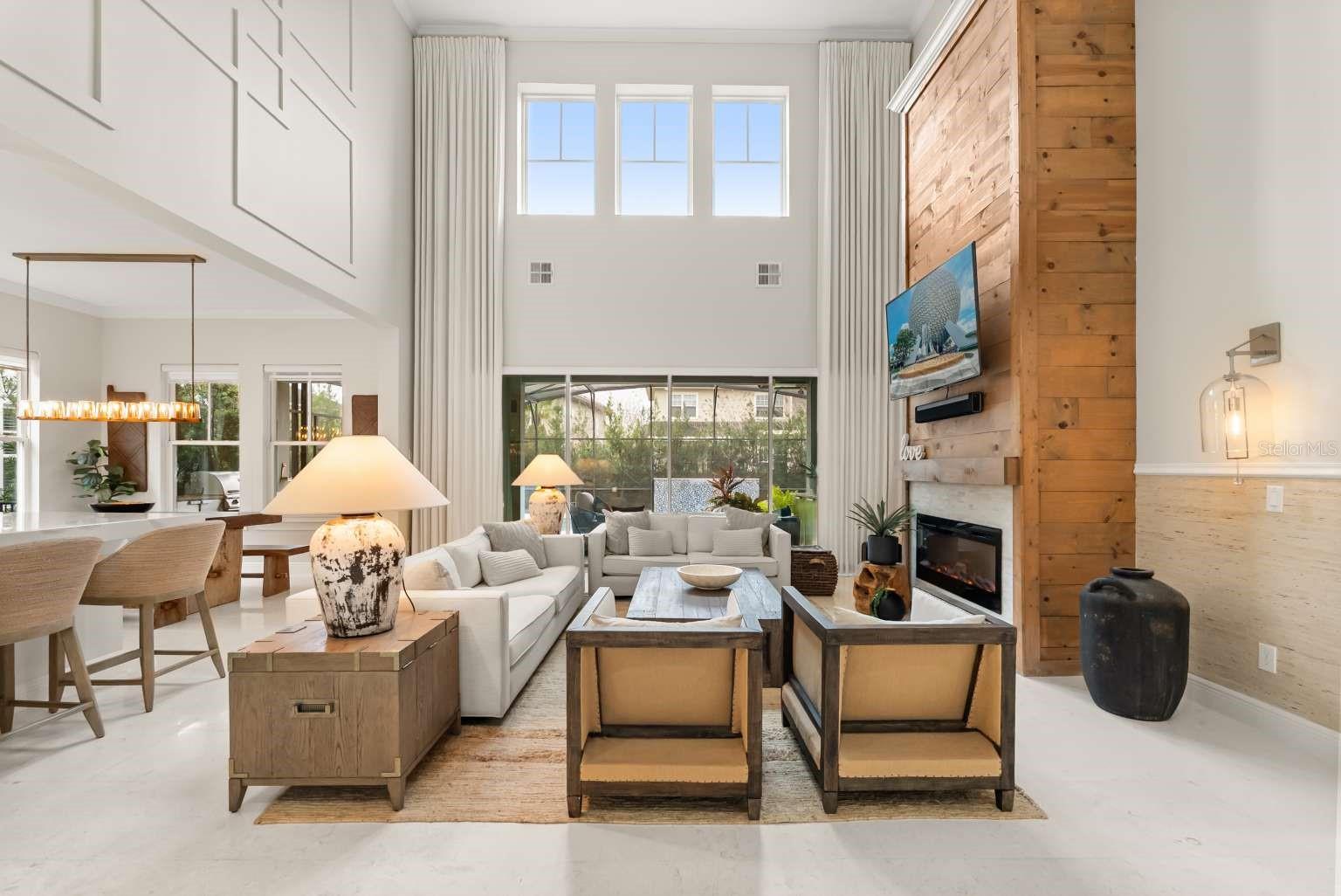 Características internas: Ceiling Fans(s), Crown Molding, Eat-in Kitchen, High Ceilings, Kitchen/Family Room Combo, Open Floorplan, Primary Bedroom Main Floor, Solid Surface Counters, Stone Counters, Thermostat, Tray Ceiling(s), Vaulted Ceiling(s), Walk-In Closet(s), Window Treatments